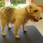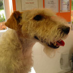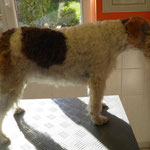Der Foxterrier auf dem oberen Bild hatte sehr weiches und blasses Fell bei seinem ersten Besuch- erschwerend kommt noch hinzu, daß die Hündin kastriert ist und Kastraten oft zu Verwollungen und dem typischen Kastratenfell neigen. Nach mehrmaligen Trimmen hat sich das Fell deutlich verbessert. Die Farben sind satter und die Fellstruktur ist härter und somit Witterungs- und Schmutzunanfälliger!