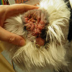 Oben links ein chronisch entzündetes Ohr- so weit kann es bei vernachlässigter Pflege kommen!